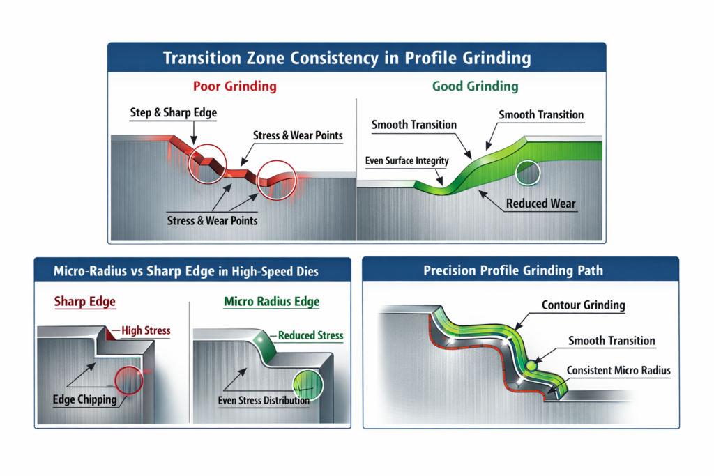 To control both transition geometry and edge radius, many precision toolrooms rely on profile grinding (PG grinding).